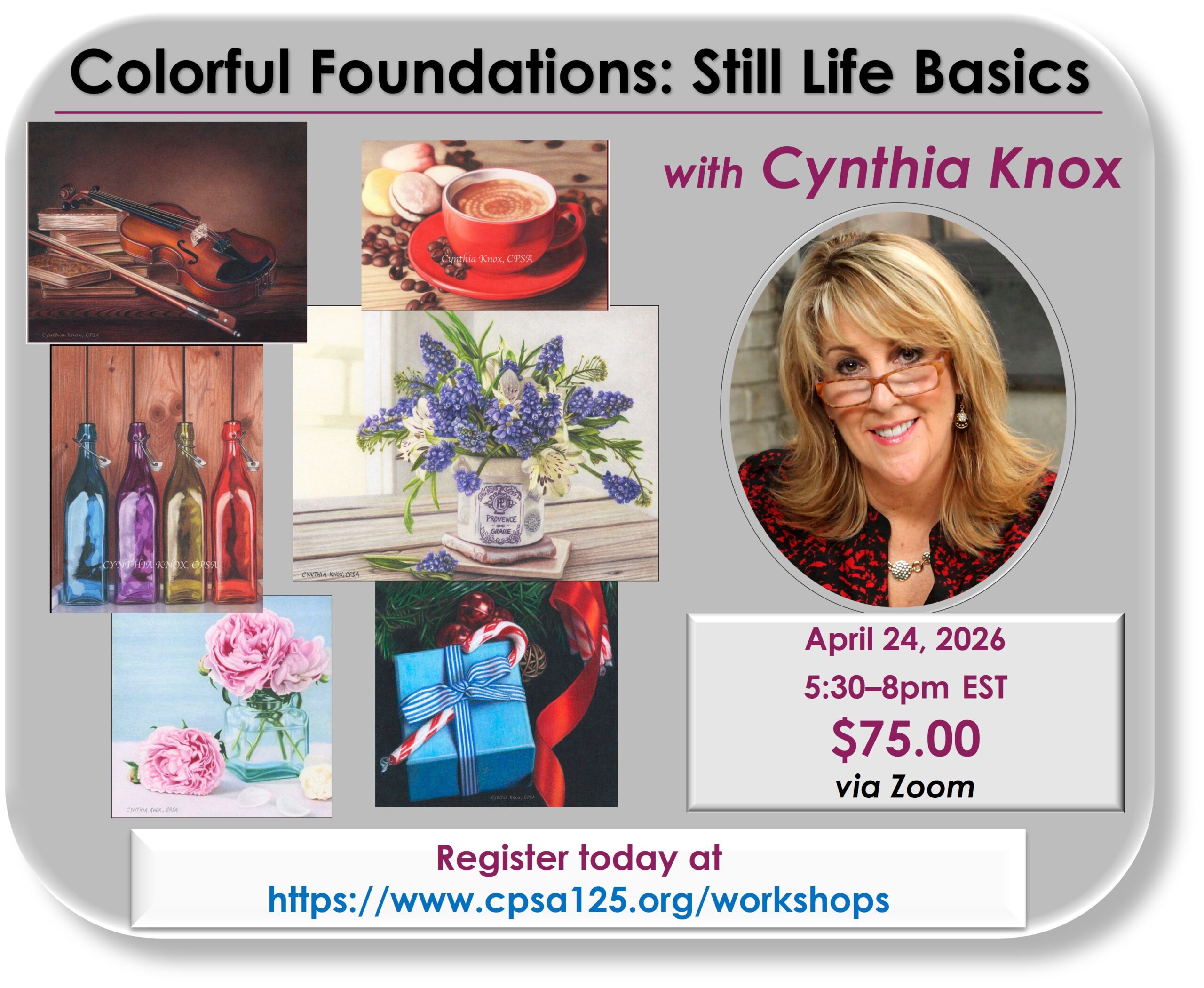 Discover (or rediscover) the timeless art of still life in this welcoming colored pencil workshop with award-winning artist Cynthia Knox. Whether you’re brand new to still life in colored pencils or an experienced artist ready to refresh your skills, this new workshop from the “Queen of Still Life” will guide you through the essential building blocks that make a still life drawing truly shine.